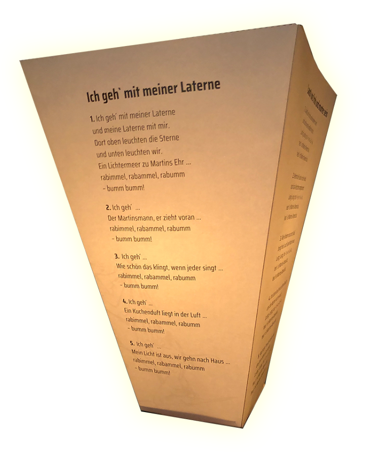 Da nicht immer unbedingt alle Teilnehmer des Martinzuges textsicher sind, haben wir eine kleine Unterstützung in Form einer Liederlaterne als Bastelvorlage produzieren lassen. Zum einen wird man damit sicher mehr Menschen zum Mitsingen der Martinslieder ermuntern, zum anderen ist es bestimmt auch schön, wenn diese Liederlaternen den Zug (zusätzlich zu den Kinderlaternen) zusätzlich illuminieren.